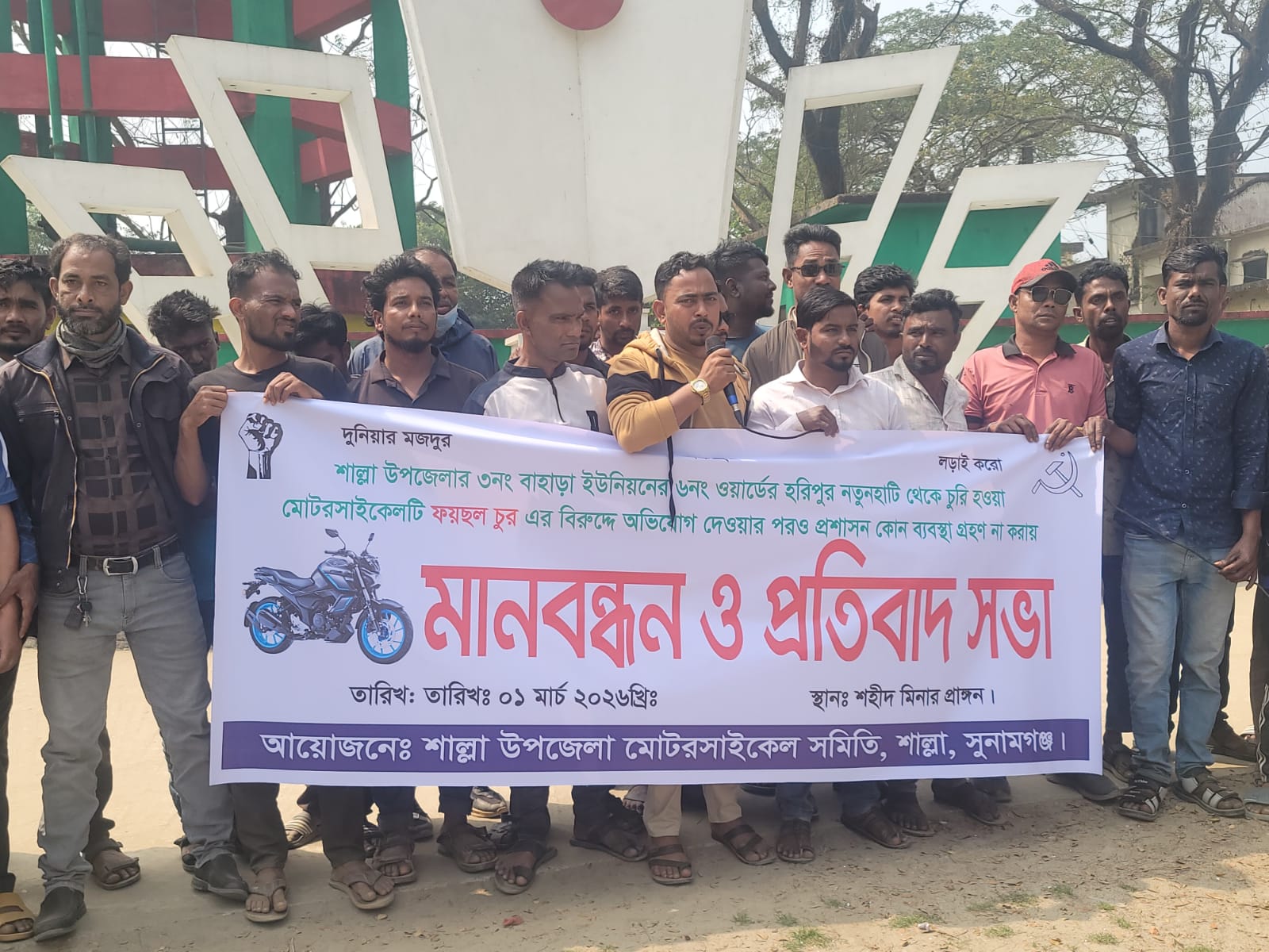 শাল্লা উপজেলা মোটরসাইকেল সমিতির সভাপতি জসিম উদ্দিনের সভাপতিত্বে ও সদস্য অনজিত দাশের সঞ্চালনায় মানববন্ধন ও প্রতিবাদ সভায় স্বাগত বক্তব্য রাখেন শাল্লা উপজেলা মোটরসাইকেল সমিতির সেক্রেটারি শাহীন আলম।
