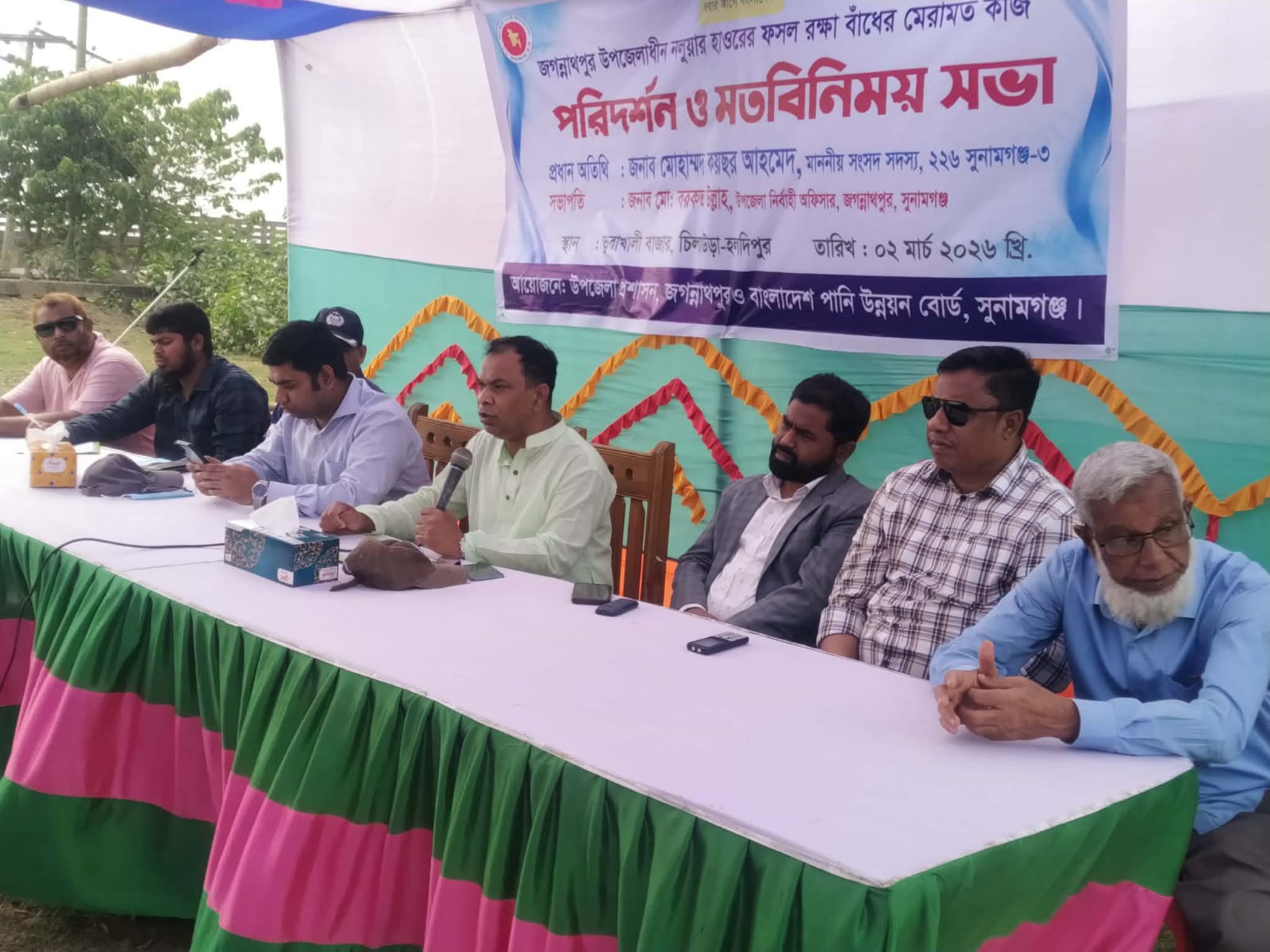 ২ মার্চ সোমবার দুপুরে সুনামগঞ্জের জগন্নাথপুর উপজেলার সর্ববৃহত নলুয়ার হাওরের পশ্চিমপ্রান্ত ভূরাখালি গ্রাম এলাকায় অবস্থিত ৪, ৫, ৬ ও ৭নং পিআইসি প্রকল্পের ফসল রক্ষা বেড়িবাঁধ পরিদর্শনকালে ও স্থানীয় ভূরাখালি বাজারে মতবিনিময় সভায় প্রধান অতিথির বক্তব্যে তিনি এসব কথা বলেন।
