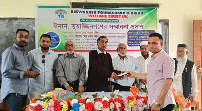 সিলেটের বিশ্বনাথে সোমবার (২রা মার্চ) বিশ্বনাথ পৌরসভা ও বিশ্বনাথ ইউনিয়নের বিভিন্ন জামে মসজিদের ইমাম ও মোয়াজ্জিনদের সম্মানে সম্মানী প্রদান করেছে, বিশ্বনাথ পৌরসভা ও বিশ্বনাথ ইউনিয়ন ওয়েলফেয়ার ট্রাস্ট ইউ‘কে। প্রতি বছরের মতো এ বছরও পবিত্র ঈদুল ফিতর উপলক্ষে ৪১ জন প্রতিনিধির মাধ্যেমে ট্রাস্টের পক্ষ থেকে বিভিন্ন ক্যাটাগরিতে ইমাম ও মোয়াজ্জিনদের মধ্যে সম্মানী প্রদান করা হয়।