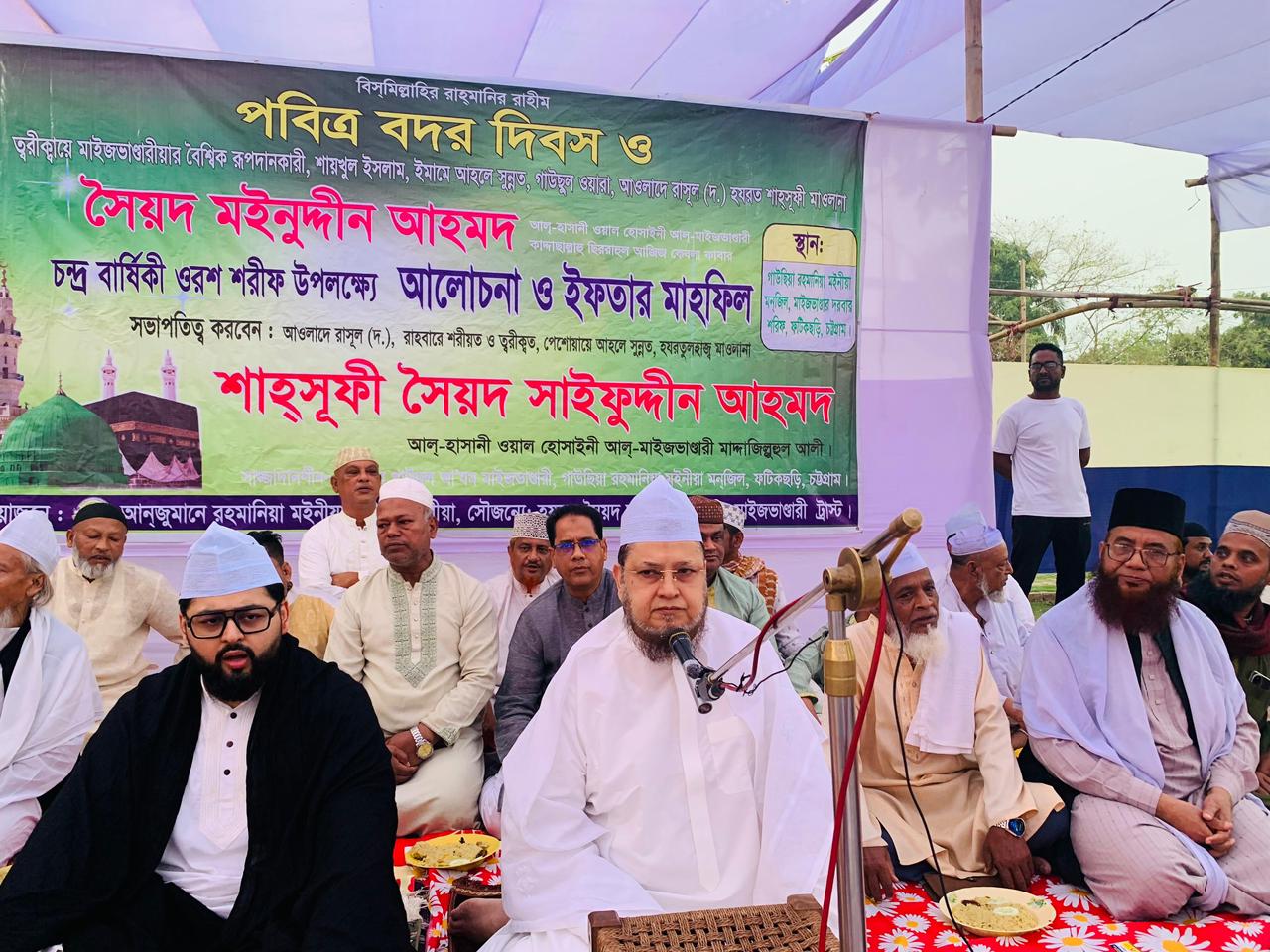 ঐতিহাসিক বদর দিবস এবং নবীকরিম (দ.)-এর ৩০তম পবিত্র বংশধর, মাইজভাণ্ডারীয়া তরীকার বৈশ্বিক রূপদানকারী, শায়খুল ইসলাম, হুযুর গাউসুল ওয়ারা, হযরত শাহসুফি সৈয়দ মইনুদ্দীন আহমদ আল হাসানী ওয়াল হোসাইনী আল মাইজভাণ্ডারী (কঃ)-এর পবিত্র আরবি চন্দ্রবার্ষিক ওরশ শরীফ উপলক্ষ্যে মাইজভাণ্ডার শরীফে "ইসলামে যাকাতের তাৎপর্য" শীর্ষক আলোচনা সভা ও ইফতার মাহফিল অনুষ্ঠিত হয়েছে। ১৭ রমজান, শনিবার (৭ই মার্চ) বিকেলে গাউছিয়া রহমানিয়া মইনীয়া মনজিল মাঠ প্রাঙ্গণে আয়োজিত এই মাহফিলে হাজারও ভক্ত আশেকানদের সমাগম ঘটে। এতে প্রধান অতিথির বক্তব্যে দরবারের বর্তমান সাজ্জাদানশীন ও বাংলাদেশ সুপ্রিম পার্টি-বিএসপি’র চেয়ারম্যান হযরত শাহসুফি সৈয়দ সাইফুদ্দীন আহমদ আল হাসানী ওয়াল হোসাইনী আল মাইজভাণ্ডারী (মা.জি.আ) বলেছেন, ‘ঐতিহাসিক বদর দিবসে সংঘটিত বদর প্রান্তরে যুদ্ধ ছিল ইসলামের প্রথম জেহাদ। দ্বিতীয় হিজরির ১৭ রজমান বদর প্রান্তরে এ ঐতিহাসিক জিহাদ সংঘটিত হয়ে মুসলমানদের বিজয় রচিত হয়েছিল। বদরযুদ্ধের মধ্যদিয়ে পবিত্র মক্কা বিজয়ের মাধ্যমে ইসলাম তথা মুসলমানদের বিজয়ের ধারা সূচিত হয়। ঐতিহাসিক বদর যুদ্ধে আবু জেহেলের ১০০০ সুসজ্জিত বাহিনীর বিপরীতে রাসূলুল্লাহ (সা.) এর ৩১৩ জন সাহাবায়ে ক্বেরাম সাধারণ অস্ত্র নিয়ে আল্লাহ তায়ালার গায়েবী সাহায্যে আবু জেহেলের বিশাল বাহিনীকে পর্যদুস্ত করেছিলেন অত্যন্ত কঠিনভাবে। তাই আমরা বদরি সাহাবাদের মত খাঁটি মুসলমান ও ঈমান ওয়ালা হতে পারি, বদরি চেতনায় উজ্বিবিত হয়ে আমাদেরকে এগিয়ে যেতে হবে। তিনি বর্তমান যুবসমাজের কাছে এই দিনের তাৎপর্য তুলে ধরা খুবই গুরুুত্বপূর্ণ বলেও উল্লেখ করেন।’