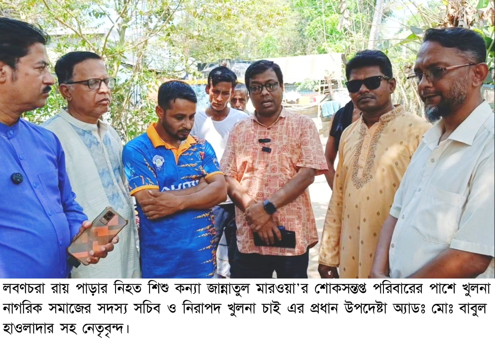 সম্প্রতি নগরীর লবণচরা থানার রায়পাড়ার কালভার্ট এলাকার বাসিন্দা শাহাজালালের কন্যা শিশু জান্নাতুল মাওয়া পরিবারের সাথে হারিণটানা থানার সাচিবুনিয়া এলাকায় মামার বিয়ের দাওয়াতে বেড়াতে যেয়ে দুরসম্পর্কের দাদার হাতে নৃশংসভাবে খুন হওয়ায় তার শোকসন্তপ্ত পরিবারকে সান্তনা এবং খোঁজ-খবর নিতে আজ শুক্রবার দুপুর ১২.০০ টার দিকে তার পিত্রালয়ে যান খুলনা নাগরিক সমাজের সদস্য সচিব এবং নিরাপদ খুলনা চাই এর প্রধান উপদেষ্ঠা অ্যাডঃ মোঃ বাবুল হাওলাদার। এসময়ে তার সাথে ছিলেন নিরাপদ খুলনা চাই এর সভাপতি সরদার বাদশা, সাধারণ সম্পাদক শেখ মোঃ দেলোওয়ার হোসেন, সাপ্তাহিক আজকের জন কথার নির্বাহী সম্পাদক নাজমুল তারেক তুষার, নিরাপদ খুলনা চাই এর নেতা তালকদার মোঃ হেলালুজ্জামান, প্রচার সম্পাদক আব্দুল আলীম, ধর্ম বিষয়ক সম্পাদক মশিউর রহমানসহ বিভিন্ন পর্যায়ের নেতৃবৃন্দ। এসময়ে নেতৃবৃন্দ জান্নাতুল মাওয়ার পিতা, দাদা, চাচাসহ পরিবারের অন্যান্যদের সাথে কথা বলেন, খোঁজ খবর নেন এবং তাদেরকে সান্তনা প্রদান করে ধৈর্য ধারণ করার পরামর্শ প্রদান করেন। নেতৃবৃন্দ এসময় হত্যাকারী গ্রেফতার হওয়ায় প্রশাসনের প্রতি সন্তোষ প্রকাশ করেন এবং মামলা পরিচালনাসহ এ দুঃসময়ে ক্ষতিগ্রস্ত পরিবারের পাশে থাকার প্রত্যয় ব্যক্ত করেন। এসময় নেতৃবৃন্দ বলেন আইনের শাসন নিশ্চিত না হওয়া এবং বিচারহীনতার সংস্কৃতির কারণেই সমাজে বারংবার এহেন পাশবিক ঘটনা ঘটে থাকে। মামলাটির প্রক্রিয়ার সাথে জড়িত সংশ্লিষ্ট সকলকে সততা, নিষ্ঠা, আন্তরিকতা, সাহসিকতার সহিত কাজ করার আহ্বান জানিয়ে খুনীর সর্বোচ্চ শাস্তি মৃত্যুদণ্ড নিশ্চিত করার আহ্বান জানান।
