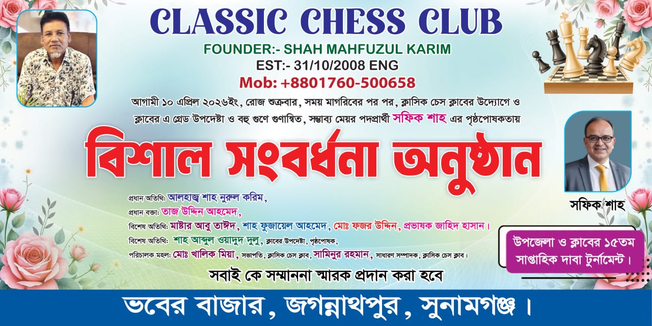 জগন্নাথপুরে ১৫তম সাপ্তাহিক দাবা টুর্নামেন্ট ও সংবর্ধনা অনুষ্ঠান ১০ এপ্রিল অনুষ্ঠিত হবে