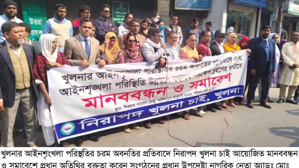 খুলনা অফিস: নিরাপদ খুলনা চাই এর মানববন্ধন ও সমাবেশে বক্তারা খুলনার আইন শৃঙ্খলা পরিস্থিতি অবনতির দায় প্রশাসন এড়াতে পারেনা। খুলনার আইন শৃঙ্খলা পরিস্থিতির চরম অবনতির প্রতিবাদে এবং আইন শৃঙ্খলা পরিস্থিতি