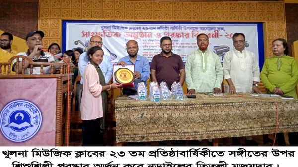 নিজস্ব প্রতিবেদক: নড়াইল জেলার কালীয়া থানার জামরিল ডাঙ্গা গ্রামের কৃতি সন্তান তিতলী মজুমদার, খুলনা মিউজিক ক্লাবের ২৩তম প্রতিষ্ঠাবার্ষিকীতে সঙ্গীতের উপর শিশুশিল্পী পুরস্কার অর্জন করে এই প্রাপ্তিতে নড়াইলের সুনাম বয়ে এনেছে