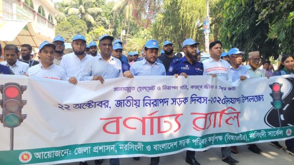 সানজিদা রুমা, নরসিংদী: মানসম্মত হেলমেট ও নিরাপদ গতি, কমবে জীবন ও সম্পদের ক্ষতি” শ্লোগানে নরসিংদীতে জাতীয় নিরাপদ সড়ক দিবস পালিত। দিবসটি উপলক্ষে নরসিংদী জেলা প্রশাসন ও বাংলাদেশ সড়ক পরিবহন