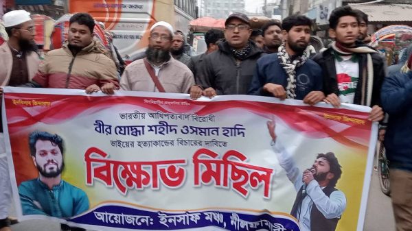 মোঃ মোস্তাকিম বিল্লাহ, নীলফামারী প্রতিনিধি ভারতীয় আধিপত্যবাদ বিরোধী বীর যোদ্ধা শহীদ ওসমান হাদির ভাইয়ের হত্যাকাণ্ডের বিচারের দাবিতে ইনসাফ মঞ্চ, নীলফামারীর উদ্যোগে এক বিক্ষোভ মিছিল ও প্রতিবাদ সভা অনুষ্ঠিত হয়েছে।